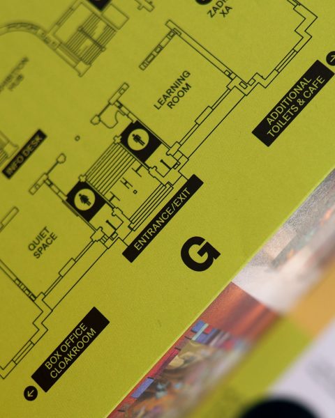 While the idea of fragmented layers and gaps was later translated into digital 3D graphics (in collaboration with artist Joseph Töreki), Rabbithole’s core focus was on making layering and cut-outs as physical and tangible as possible across applications. Die-cut holes in the exhibition brochure reveal glimpses through multiple folded layers. Information boards overlap wall text. A Timeline wall display is constructed from multiple stacked components, rather than a single flat graphic.