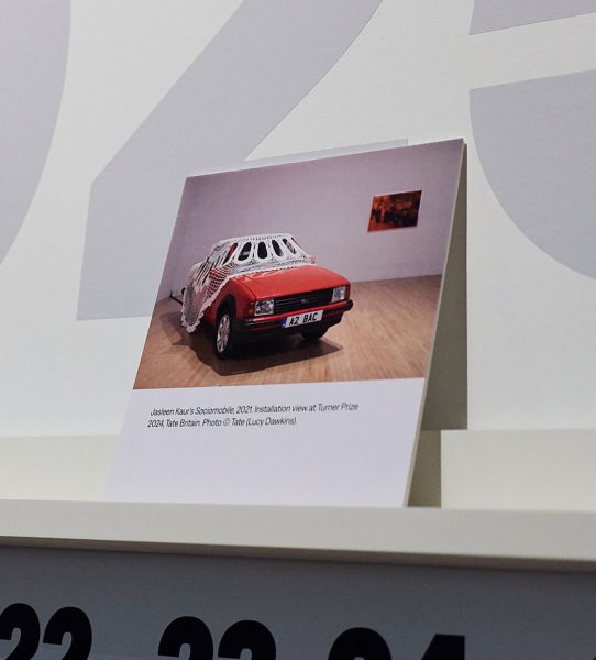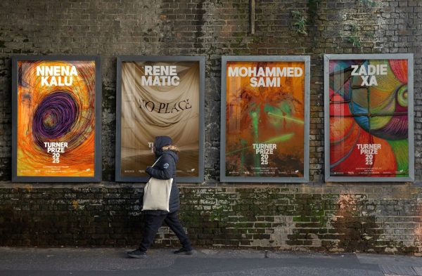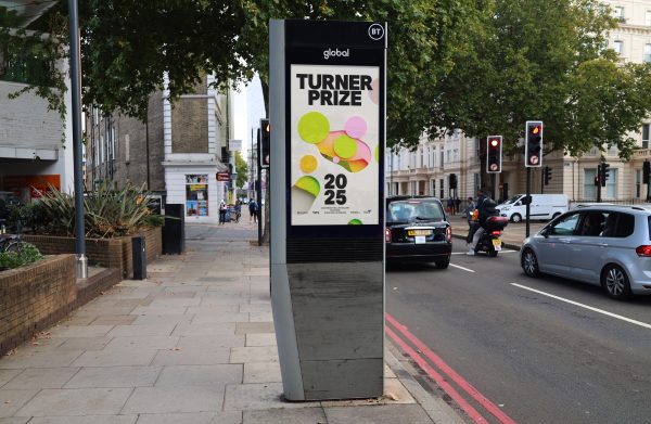 The implementation of the Turner Prize 2025 identity was comprehensive, encompassing out-of-home posters and billboards, a bus cover, printed brochures, video idents, a physical entrance hall display, exhibition labels, and more.